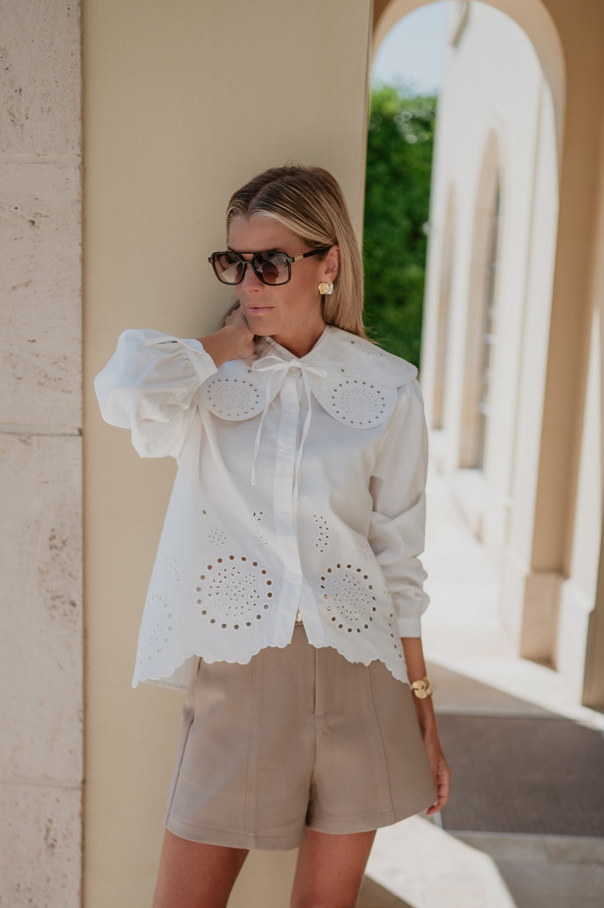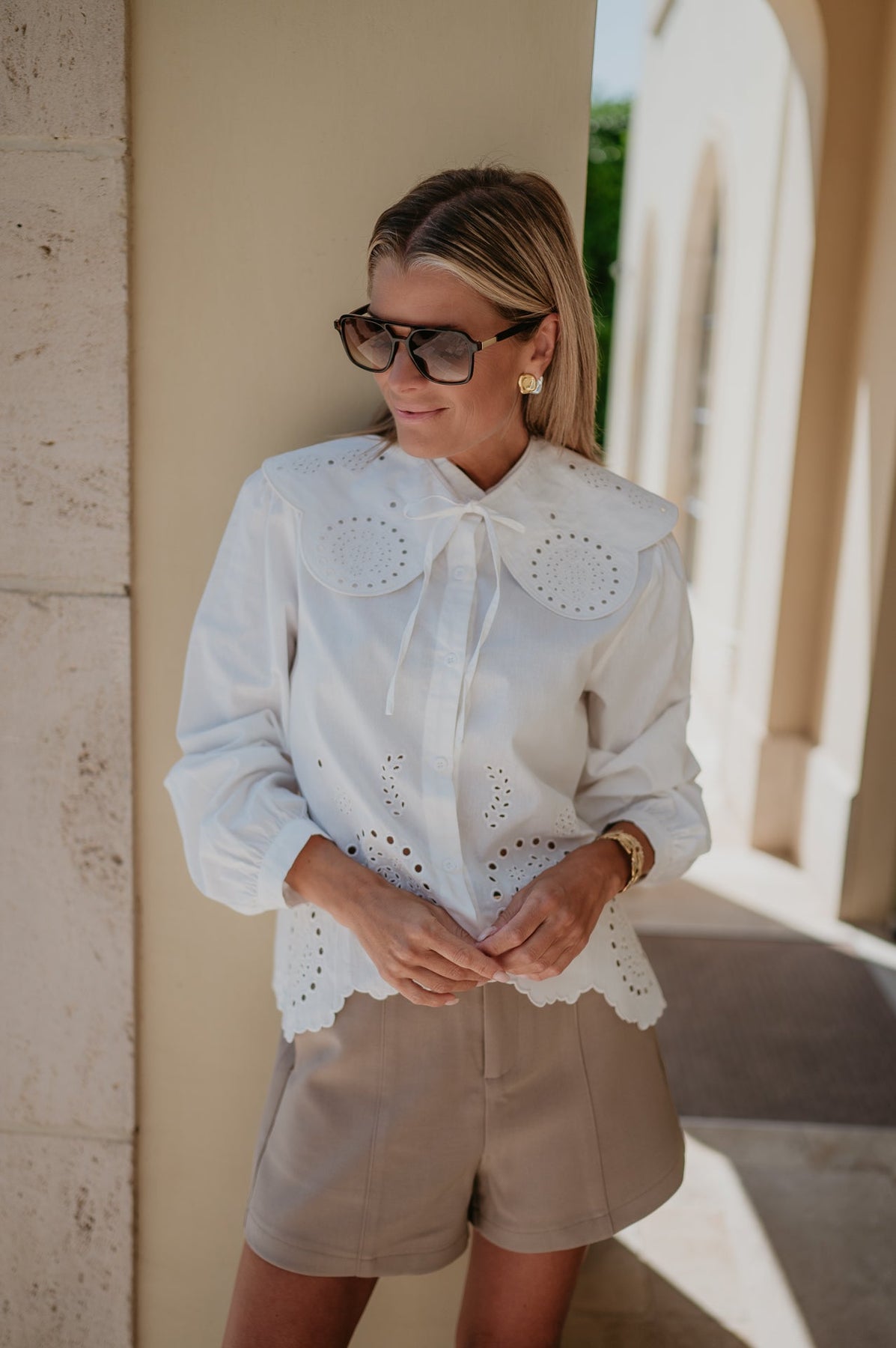 De afneembare kraag zorgt voor een speelse twist en je kan het bloesje ook zonder kraag dragen.