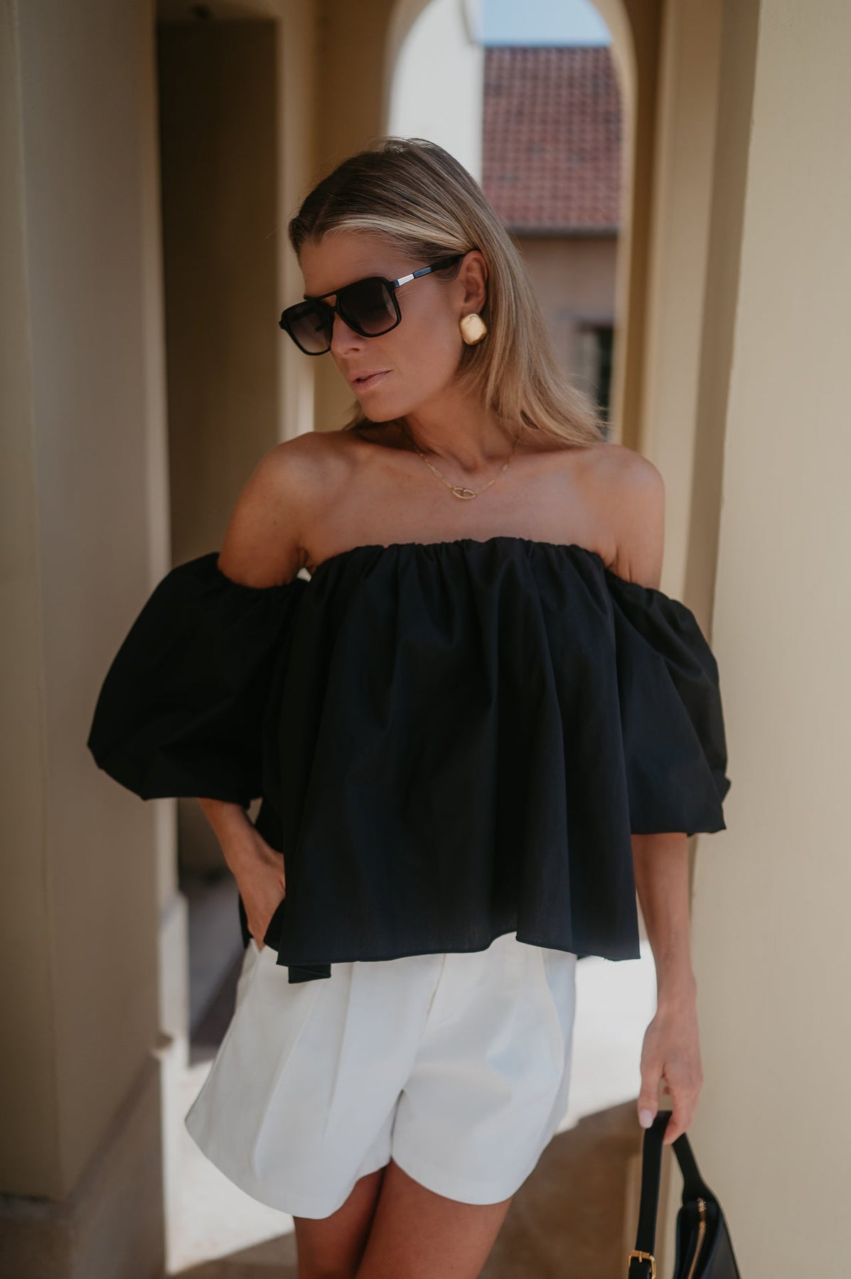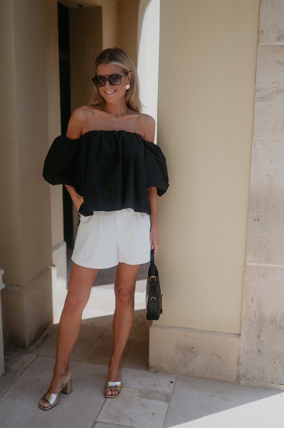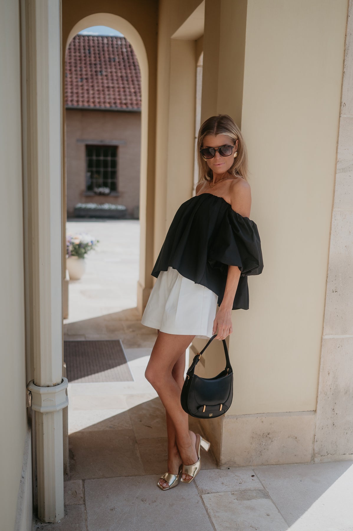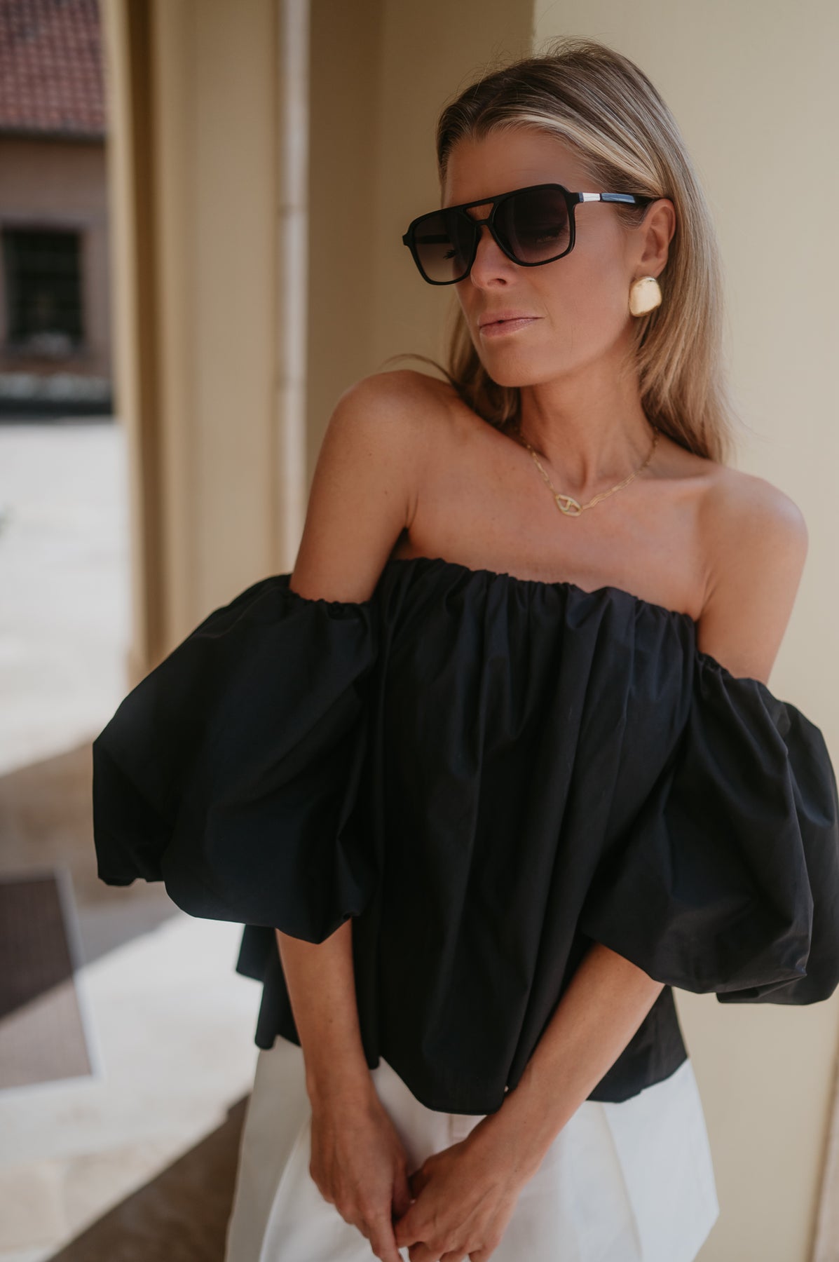 De blote schouders zorgen voor een elegante en vrouwelijke uitstraling, terwijl de volumineuze mouwen een speelse, modieuze touch geven.