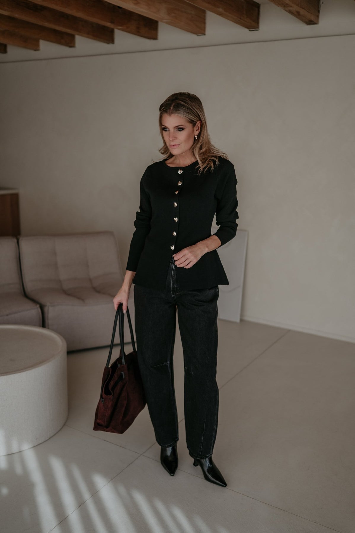 Deze toffe top met gouden knopen geeft je outfit meteen een chique touch.