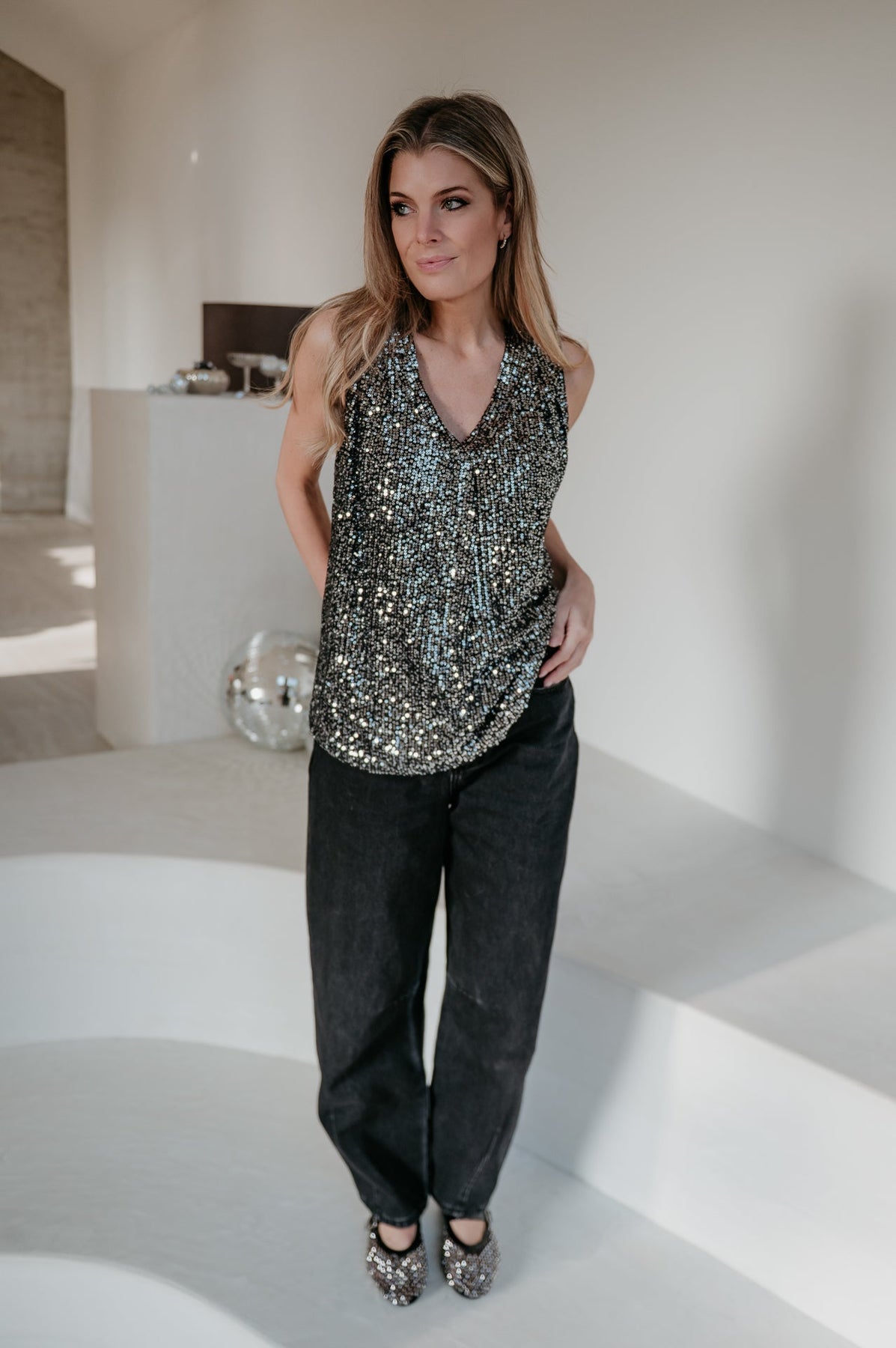 Dit glitter topje is een absolute must-have voor een avond vol glamour.