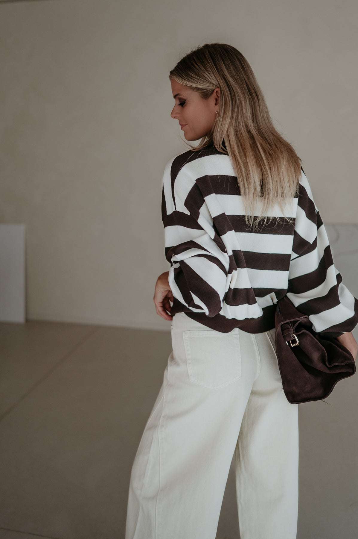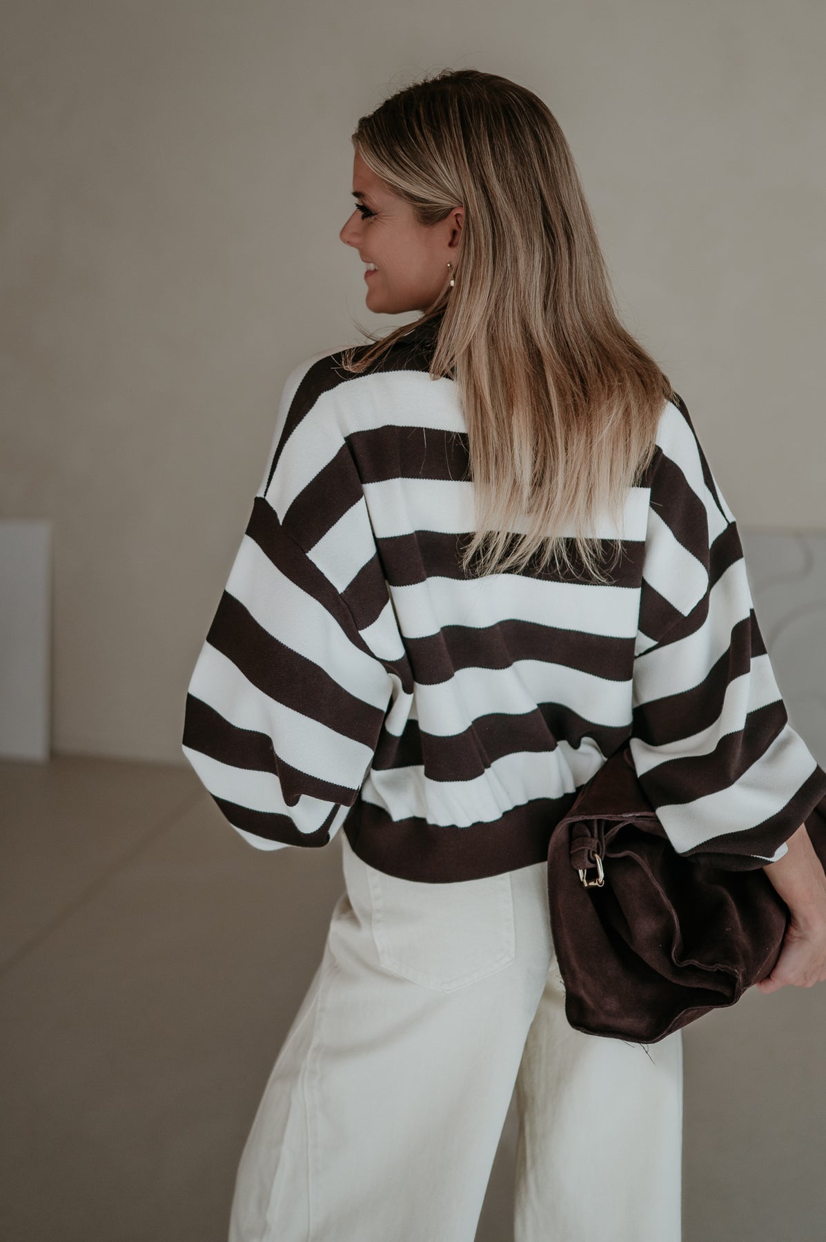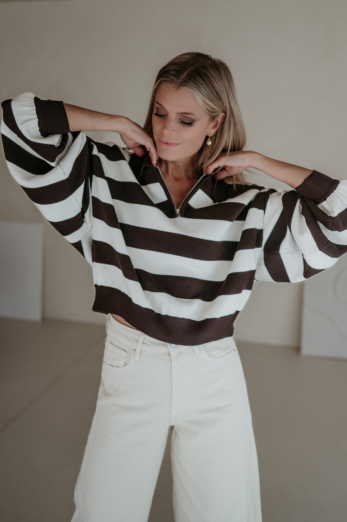 Deze mega leuke trui met witte en bruine strepen heeft een sportieve polo kraag met een kort ritsje voor een casual-chique look.