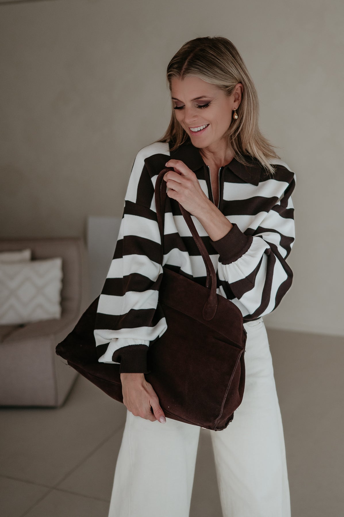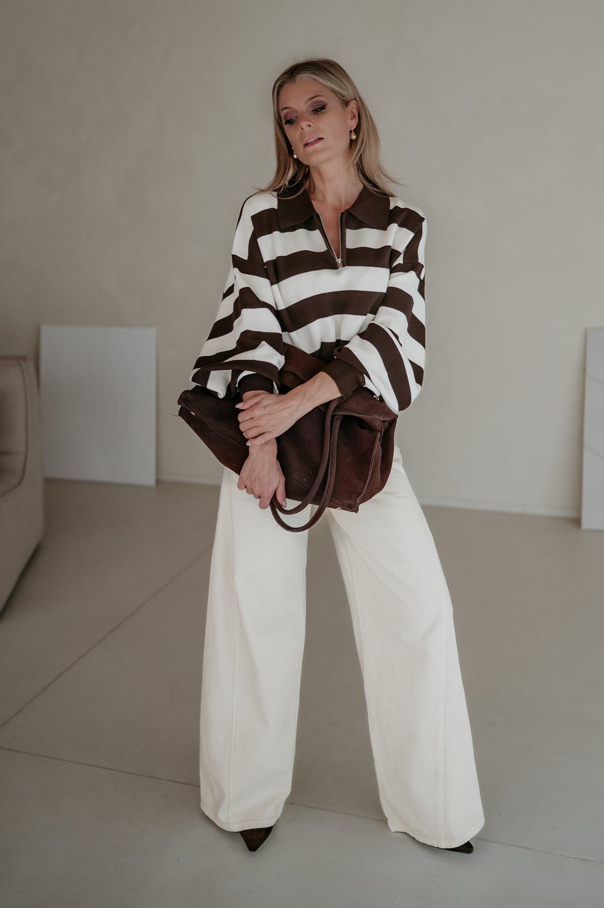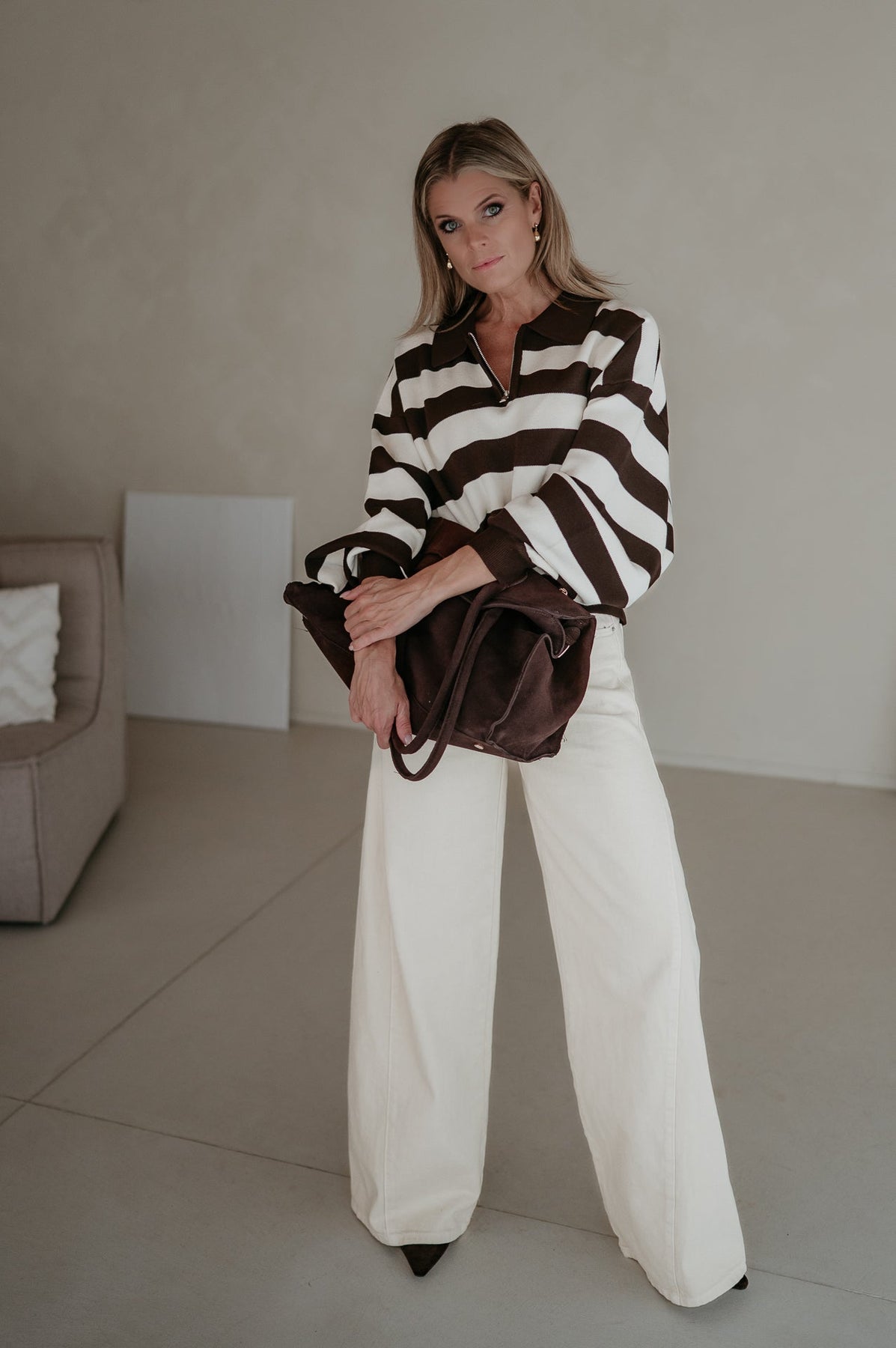 Deze mega leuke trui met witte en bruine strepen heeft een sportieve polo kraag met een kort ritsje voor een casual-chique look.