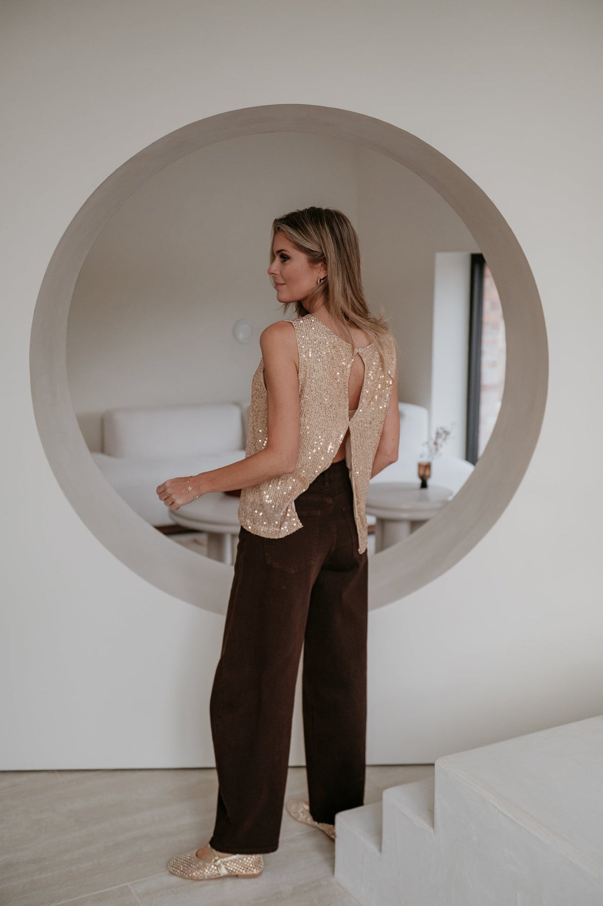 Deze top met goude glitters en een open rug is de perfecte mix van glamour en speelsheid.