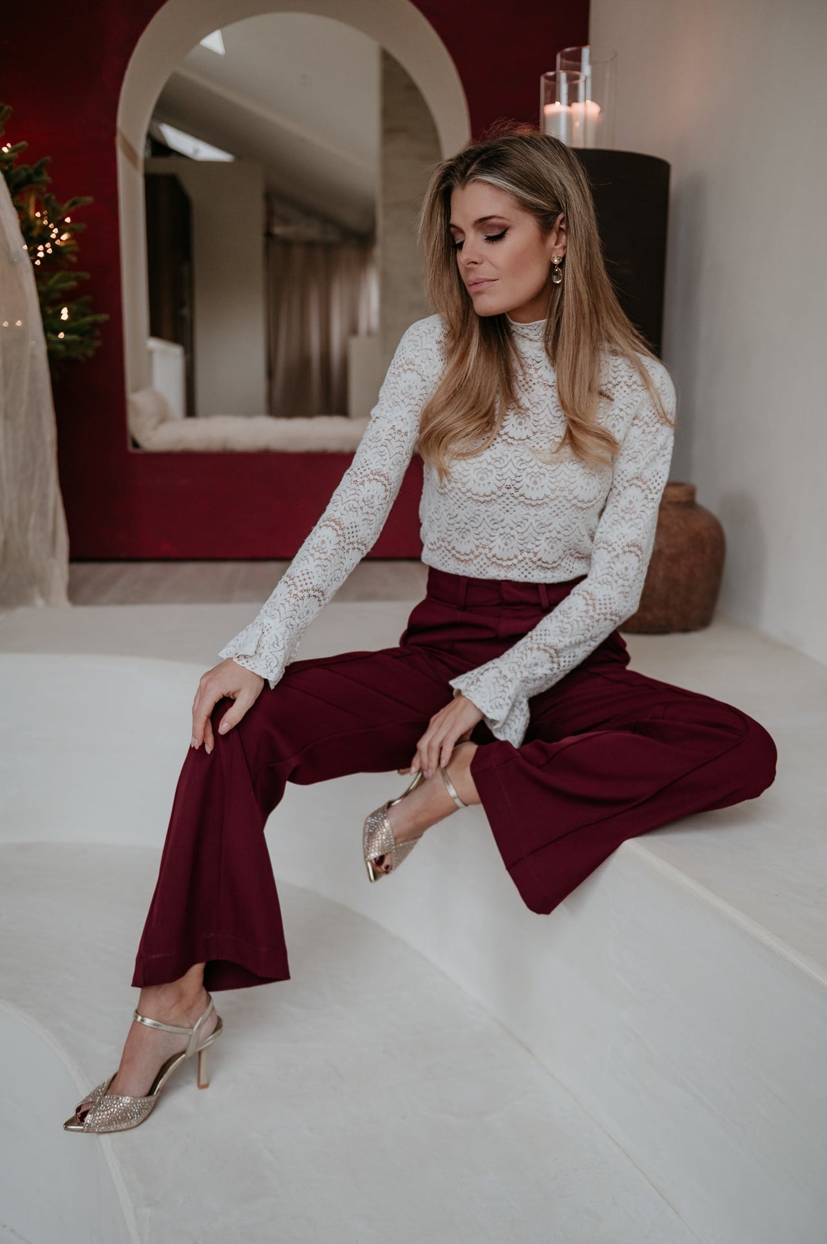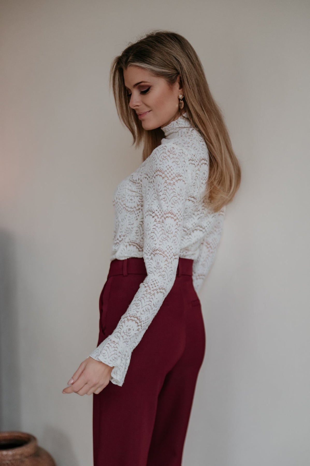Een prachtig bloesje met fijne kantdetails en wijduitlopende mouwtjes.